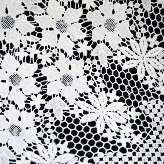This piece of chemical lace attracts your attention with elaborate floral details. Its patterns are arranged in a symmetrical and neat order. This beautiful lace will give fashion designers lots of inspiration.