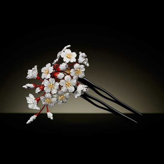- Material: 18K yellow gold, 18K white gold, palladium, diamonds, Japanese lacquer.