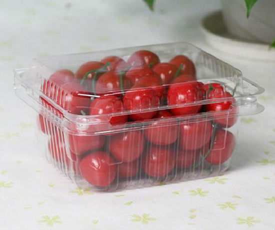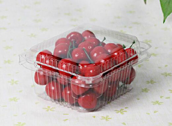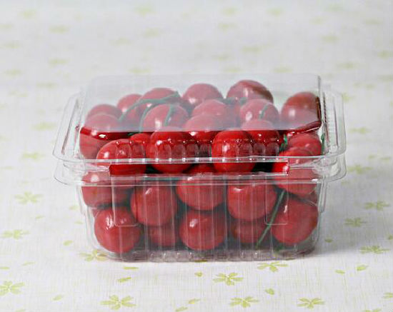 Displayed here is a cherry packing box made of plastic material. It is constructed in a rectangular upright structure for a space-saving design. This box flaunts a hardwearing structure and a long service life. It offers the products protection from dust, dirt, moisture and scratching.