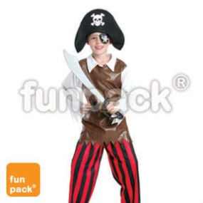 This child pirate costume includes: head piece, top, pants, and eye patch.