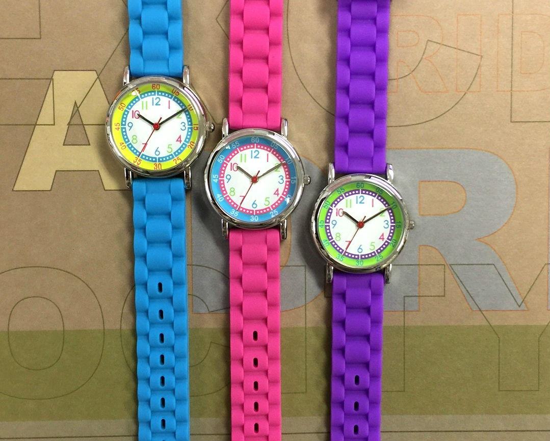This children watch features a round analog dial along with hour, minute and second hands. The multicolored Arabic numerals make it fun for children to learn to tell time, while the soft silicone watch strap completes the look of this charming watch.