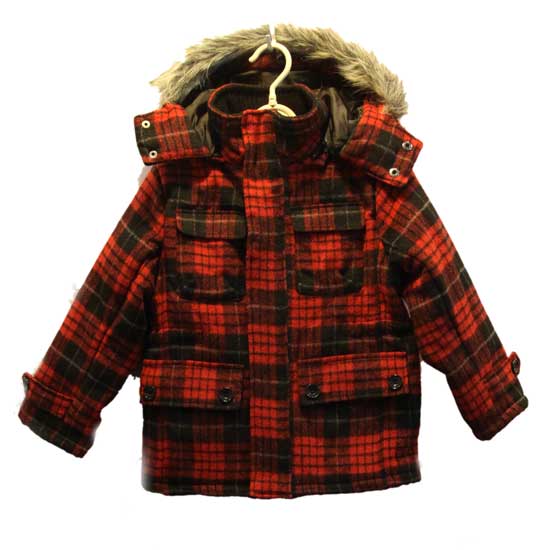 The children's coat is made of a blend of polyester and wool. It is completed with an engaging checked design. This piece is also trimmed with fur for a dash of style.