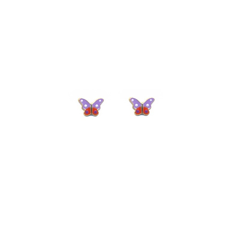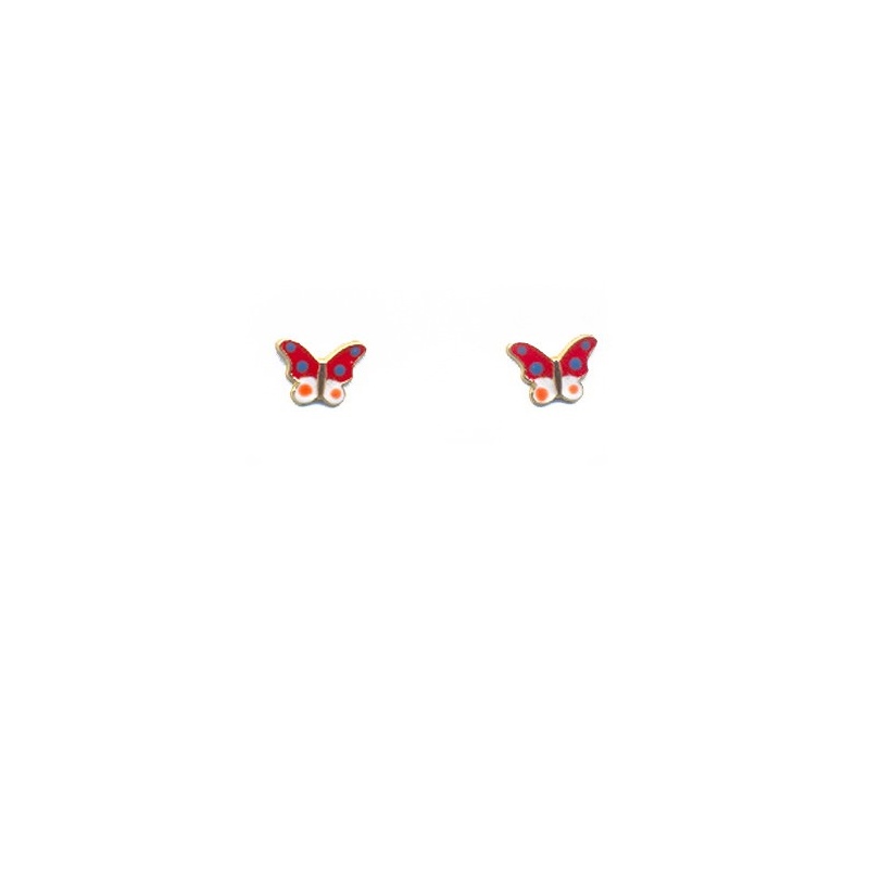 Highlighted here is a pair of earrings with a colorful butterfly pattern. The enamel and gold settings showcase a refined touch. This lovely pair of earrings is suitable for children to wear.