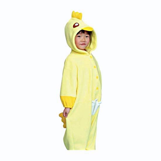 This children's jumpsuit features an adorable chicken image with a cute cartoon hood. The buttoned closure at the front allows easy wearing. Children will look exceptionally lovely in this soft yellow jumpsuit.