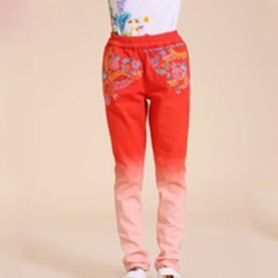 These are children's long pants coming with a fading orange finish. Made of cotton, polyester and spandex, the pants keep you warm and comfortable in cool weather. They are perfect to pair with a pair of sports shoes and sneakers.