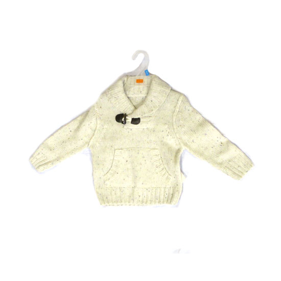 This is a children's pullover in white with exquisite patterns. It is made from blended yarn which is 70% acrylic and 30% wool. Keep your child warm in the cold winter with this sweater.