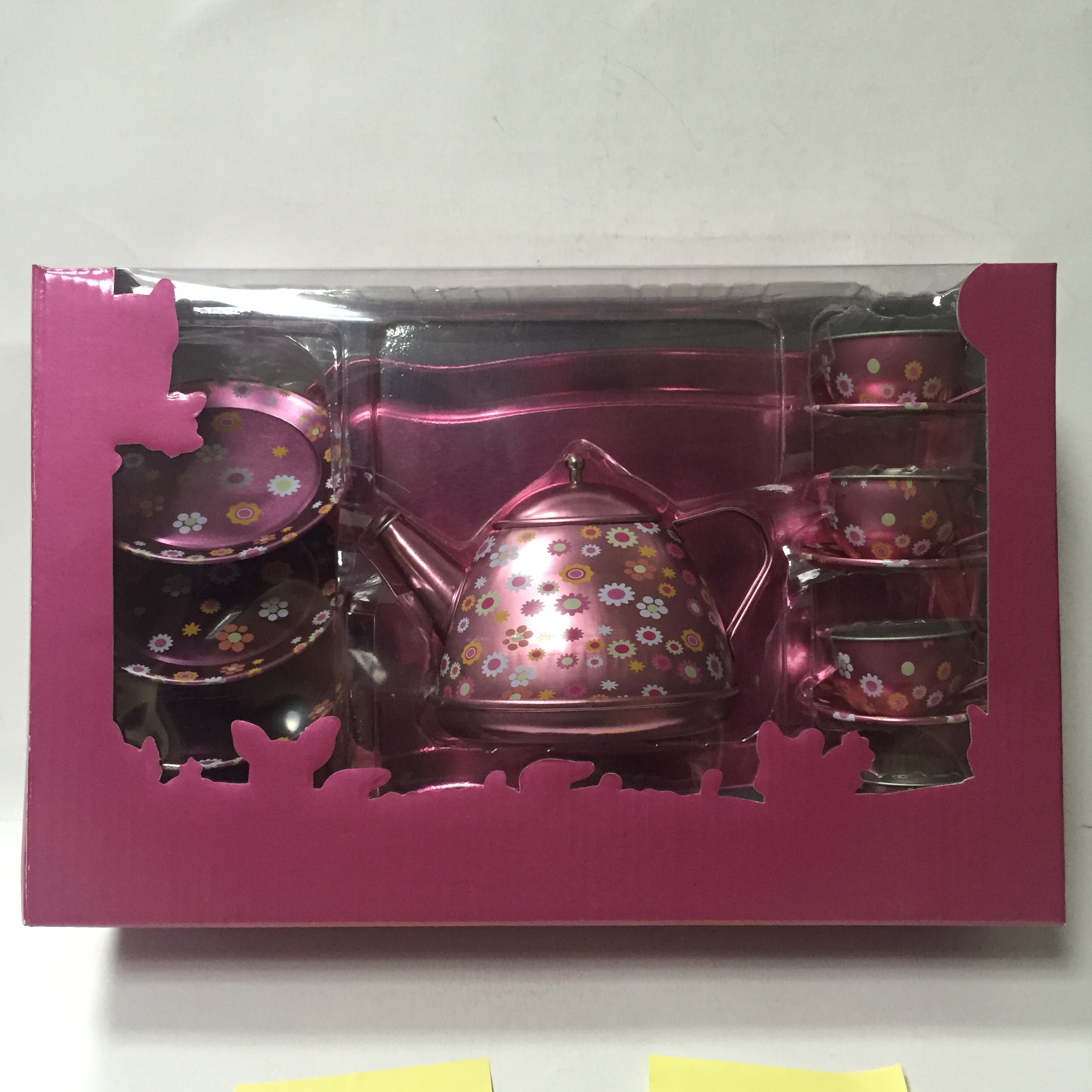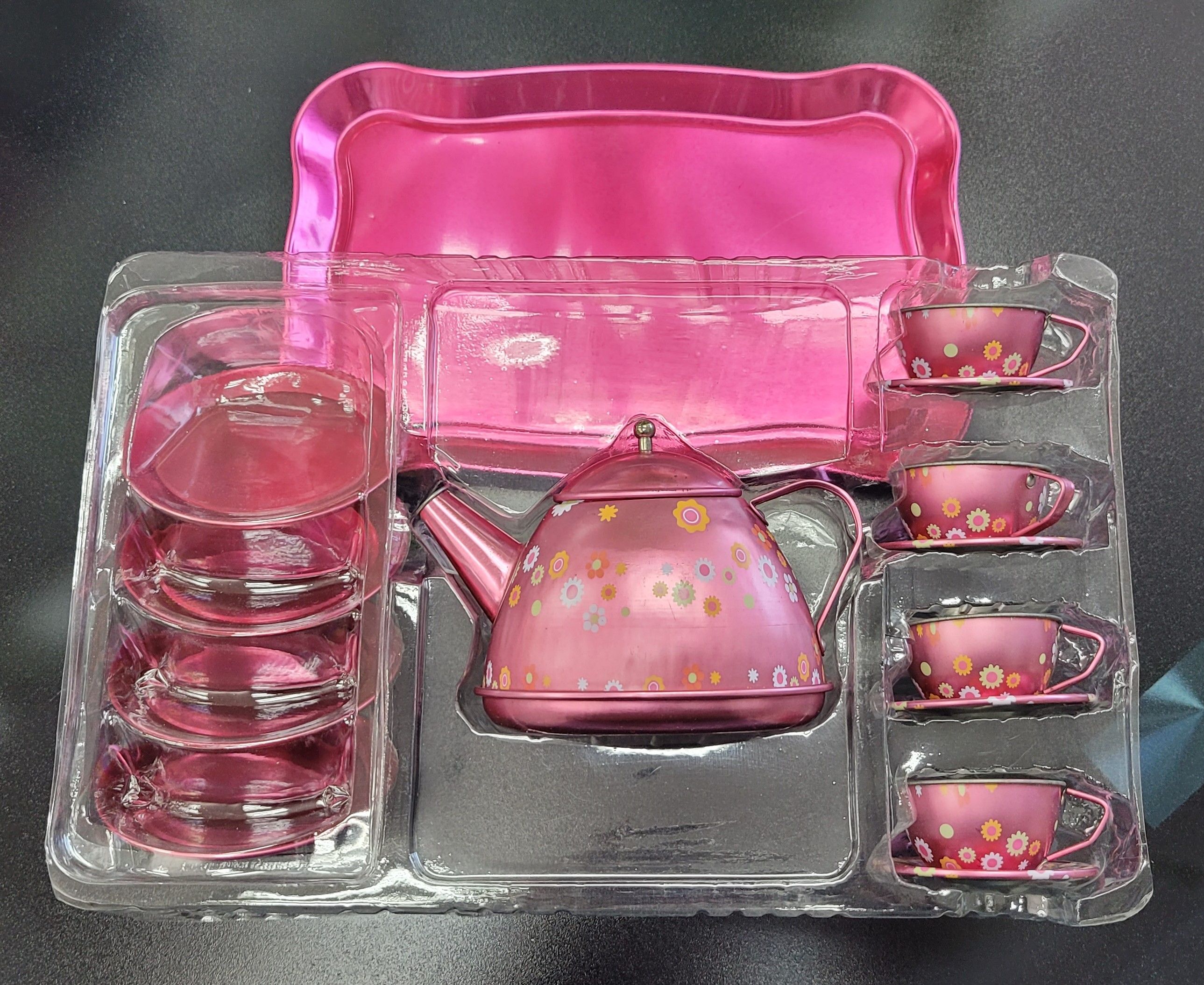 This children's tea set includes a large teapot, cups, plates and a tray for an authentic touch. Each piece is decorated with colorful and vibrant patterns. Finely made of tin, this durable tea set is great for extended playing.