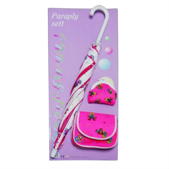 Playfully designed, this special umbrella set includes a girlish umbrella, a pink-toned coin purse and a matching handbag. The umbrella flaunts a colorful two-toned canopy, while the kiss-lock coin purse and flap-closure handbag feature an allover clown pattern, which match perfectly to create a unique style for your little one. Similar cartoon motifs are printed on each accessory for a stunning style.