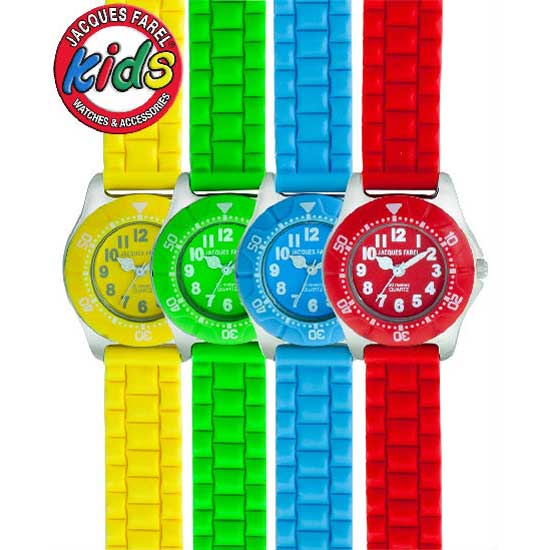 Showcased is a series of kids' analog watches designed in bright colors. The construction includes a rotating bezel with marking for measuring elapsed time. The white Arabic numeric hour markers and watch hands look great with the colored dial and watch band.