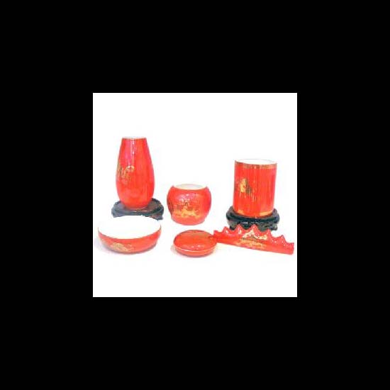 The brush pots, brush stands and inkstone container have a golden dragon on a red backdrop