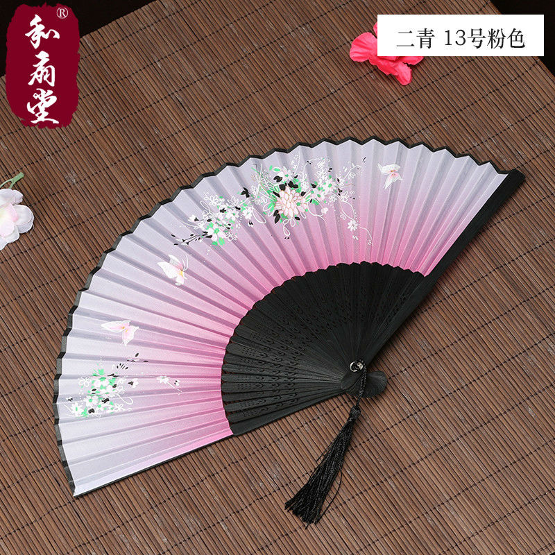 Folding hand fan, oriental flower prints on a simple backdrop, Tassel embellishment