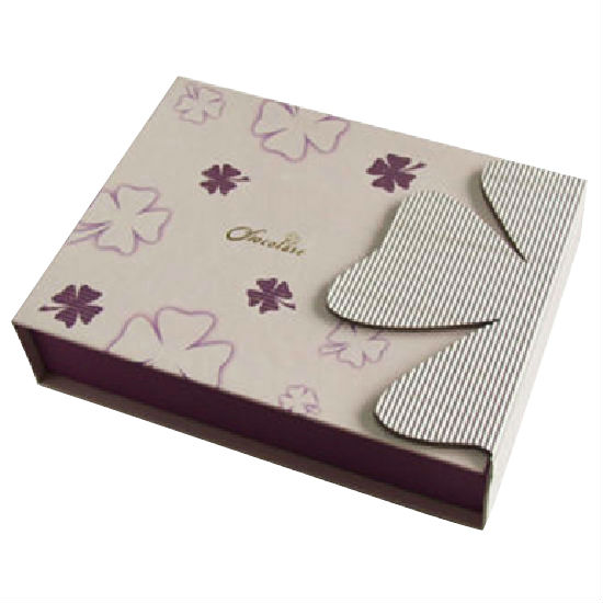 This rectangular box is excellent for chocolate packaging. It is adorned with four leaf clovers on the exterior and has a cutout four leaf clover on the side. This box can keep the stored chocolate in good condition and is safe and hygienic to use.