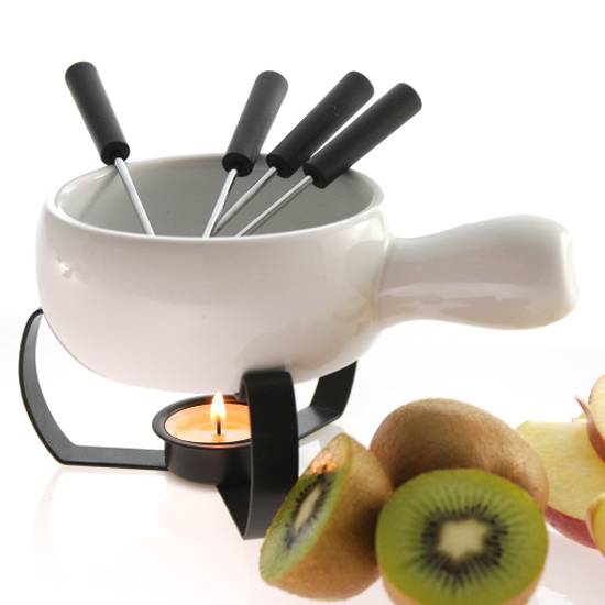 This is a chocolate fondue set of a pot and four forks. The white ceramic bowl comes with a big handle, which makes it easy and safe to carry. It allows users to enjoy the Swiss cuisine with friends and family at home.