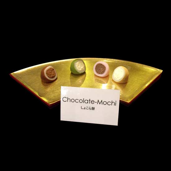 Showcased is chocolate mochi with a soft and smooth texture. The sweet aroma and flavor matches tea and coffee perfectly. This light and flavorful mochi is a great idea of snacks for children.