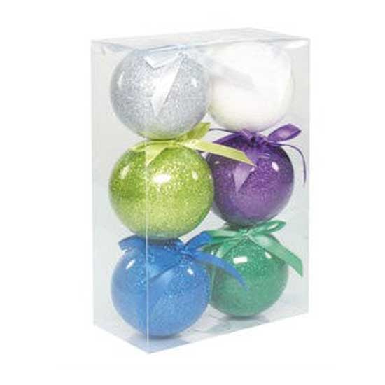 The Christmas ball box set features a PVC-made box and 6 balls. The rectangular-shaped box is transparent. The balls are trimmed with ribbons for added appeal.