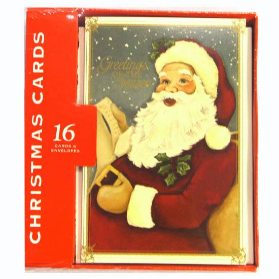 This is a set of 16 Christmas cards for posting. The cards feature a painting of Santa Claus decorated with a golden frame for a classic style. The decent appearance will fill your heart with joy.