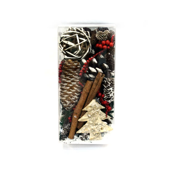 This natural cone potpourri set comes with decorations of cones, a Christmas tree, sticks and so on. White snow details offer the set an enchanting festival flavor. This exquisite cone potpourri set is ideal for Christmas decoration.
