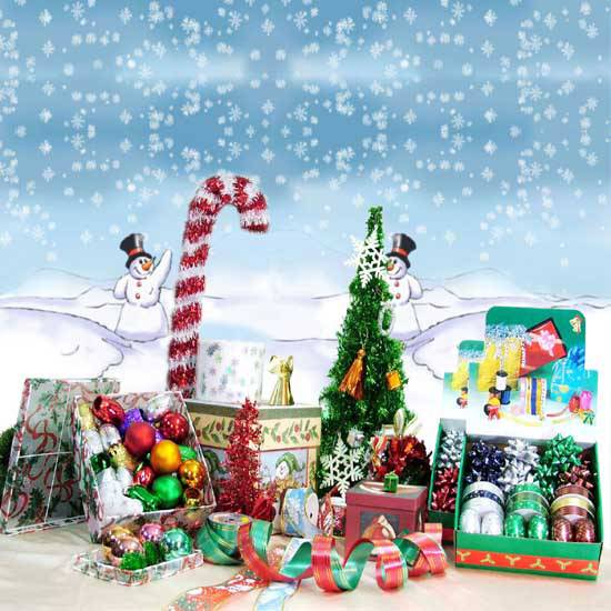 Featured here is a full package of decorations for Christmas. Model Christmas trees, ribbons, lacing, assorted baubles and tinsel garlands are included.