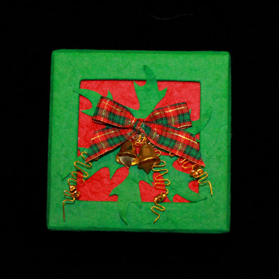 The featured Christmas gift box is designed in a green-and-red palette to create a holiday mood. A gingham bow and two mini bells are placed on the lid for added fanciness. This decorative gift box is the ideal piece to pack and present Christmas presents.