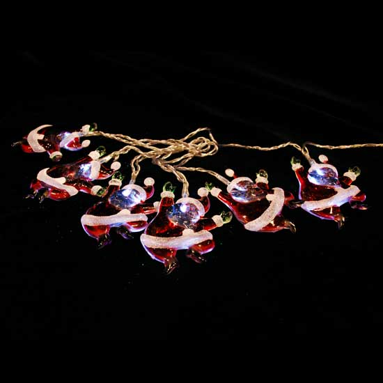 Pictured is a Christmas decorative string light powered by batteries. It features a string of Kris Kringle-shaped adornments with amusing postures. The string light can be mounted easily with little maintenance required.