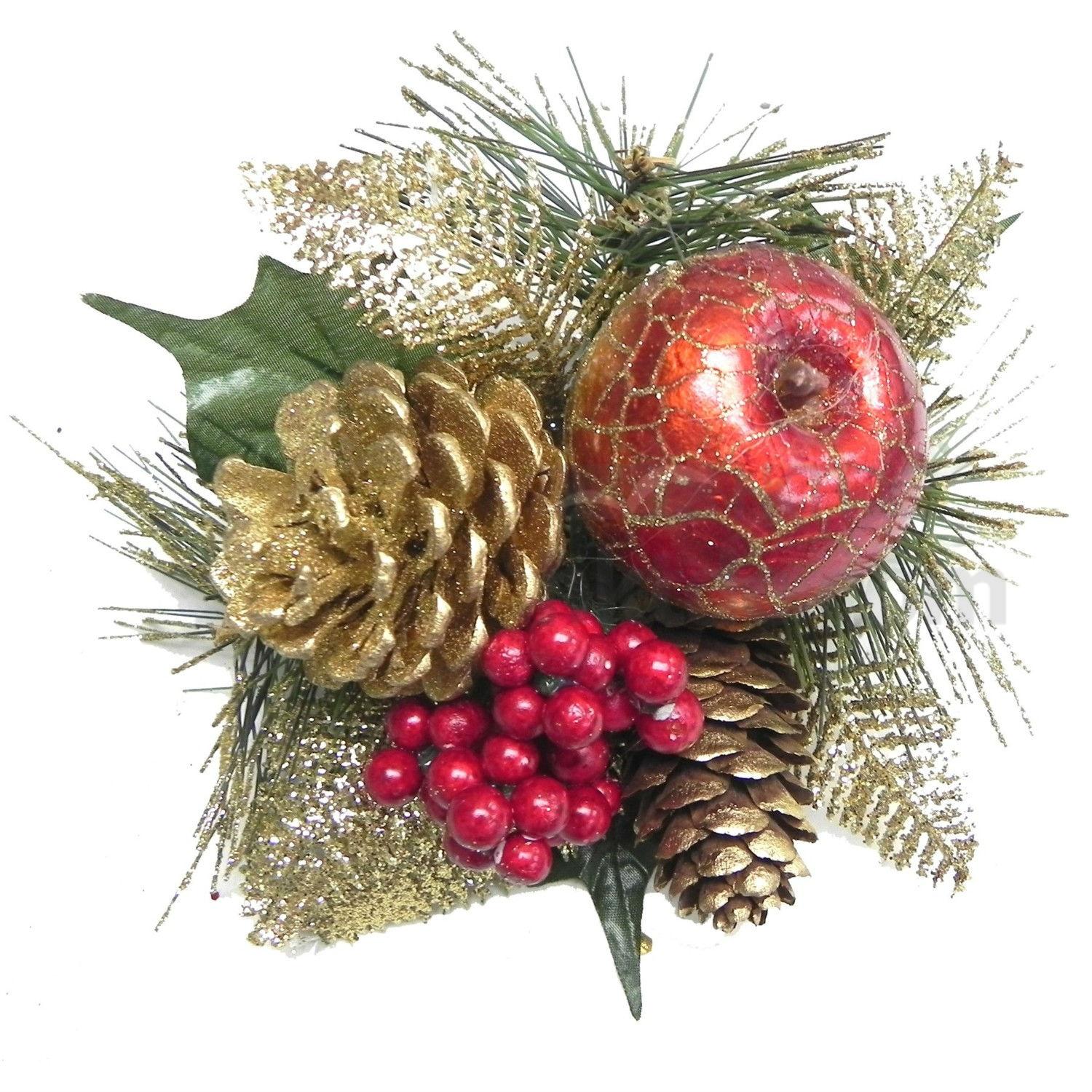 7" pvc x'mas pick w/red/gold apple (2-tone), red berries, gold cone & gold glitter leave decoration
