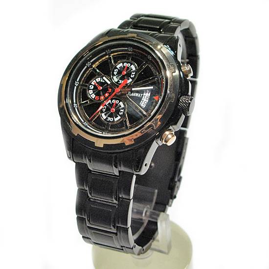 As shown is a chronograph watch with a carbon fabric watch casing and band. The carbon fabric feature of this watch contributes to its high durability. This watch is equipped with another 3 small dials for different purposes.