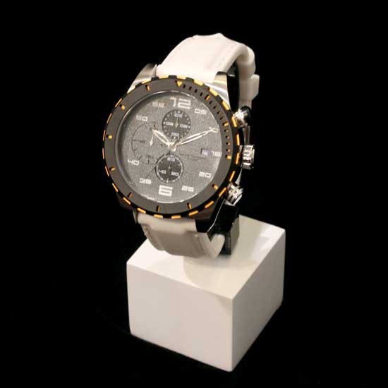 This is a men's chronograph watch coming with 3 sub-dials, a date display, white numerals and delicate hands. It features a deep black bezel with yellow markers and highlights to create a bright and outstanding color contrast. The stunning wristwatch is completed with pure white silicone bands for an elegant and stylish finishing touch.