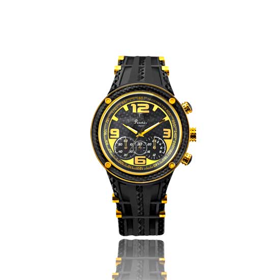 This is a classic chronograph watch that features a modern and elegant design. The round dial face has an Arabic numeral display, three sub-dials and three hands. The high-quality silicone strap fits comfortably on your wrist.