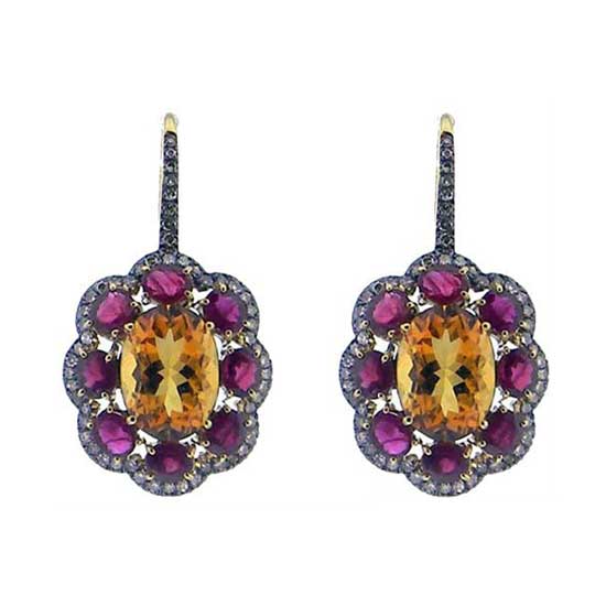 This is a pair of earrings that comes with a simple yet elegant floral design. The pair of yellow citrines is surrounded by attractive ruby gemstones and diamonds. This pair of earrings is easy to mix and match with your high-fashion wear.