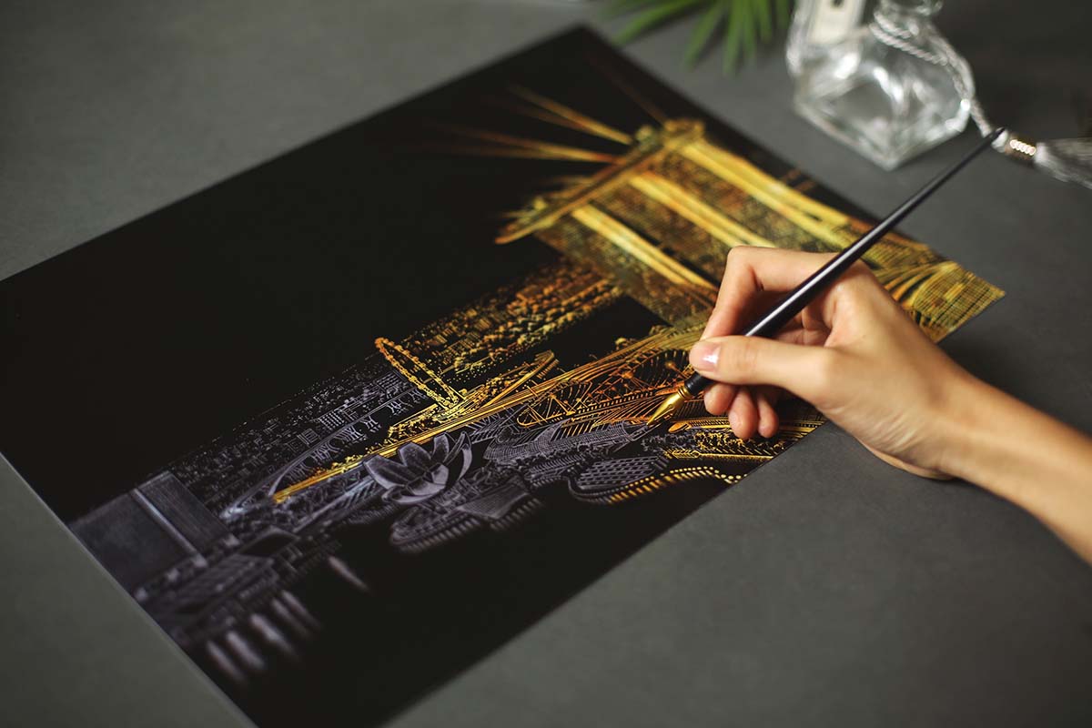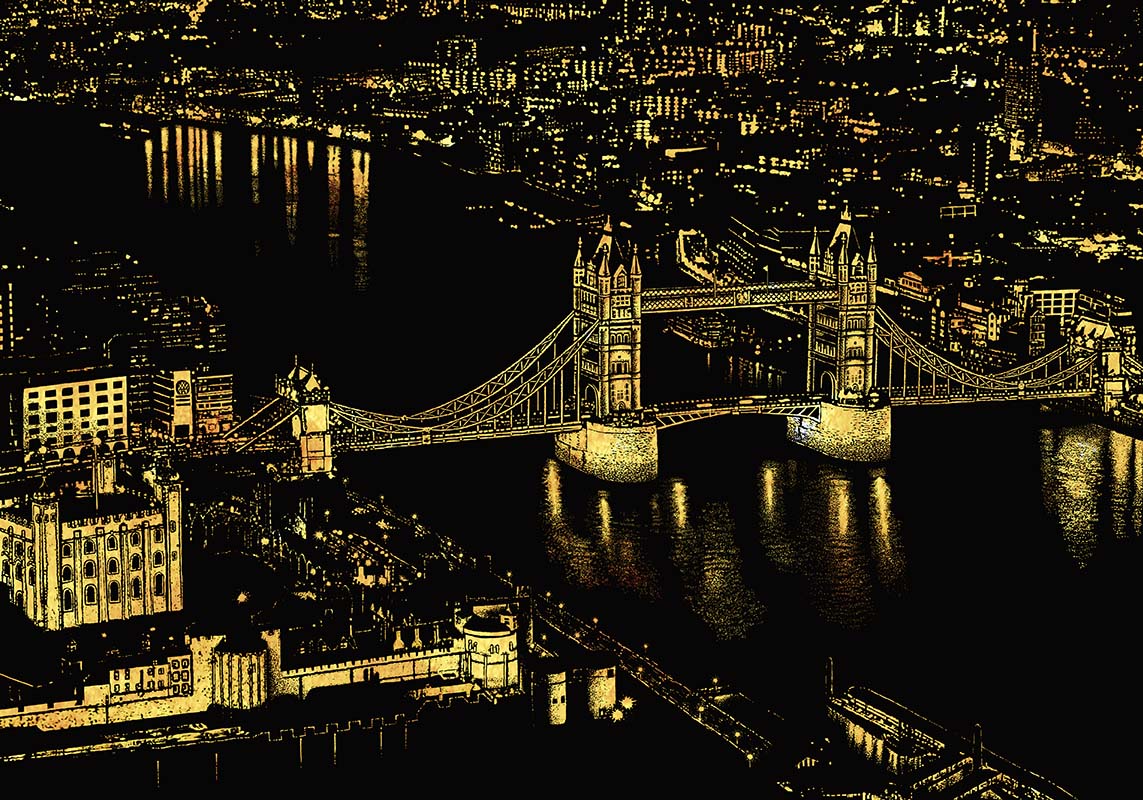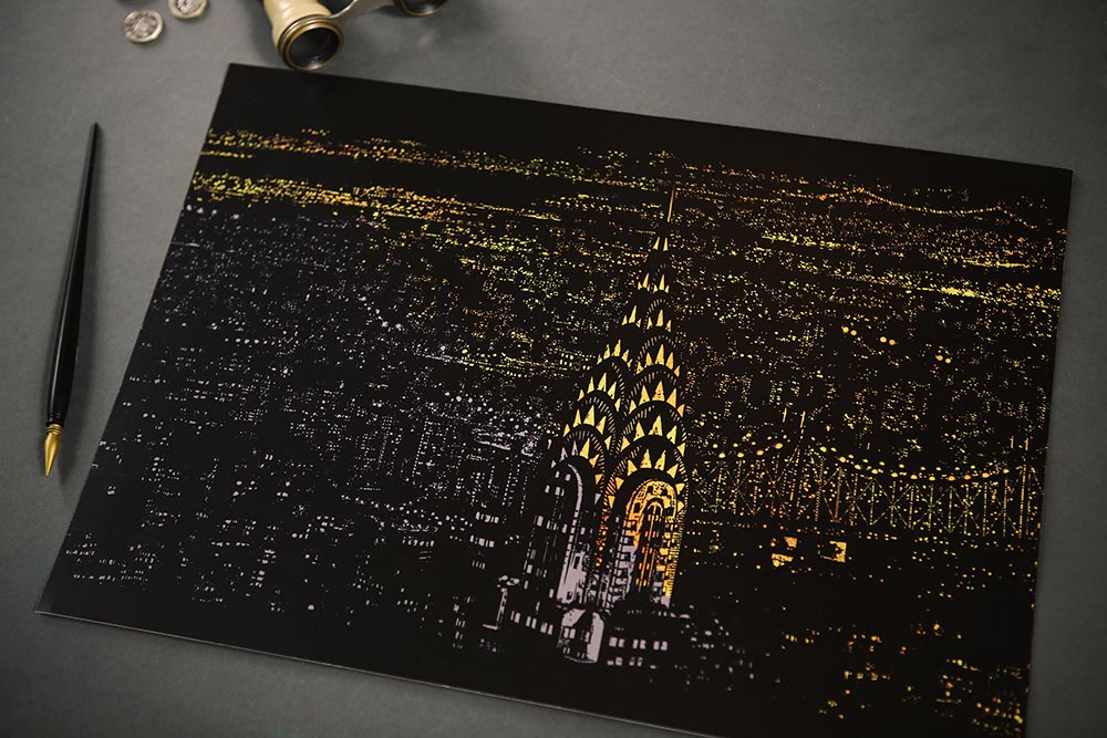 Light up the world's most famous cities. Choose a destination where you have been or would like to visit once in a lifetime. Scratch off grey outlines to unravel colors, and the initial monochromatic board will reveal beautiful night views of famous cities. Your delicate and soft touch will turn the big city into a piece of art, which makes a great home decoration item