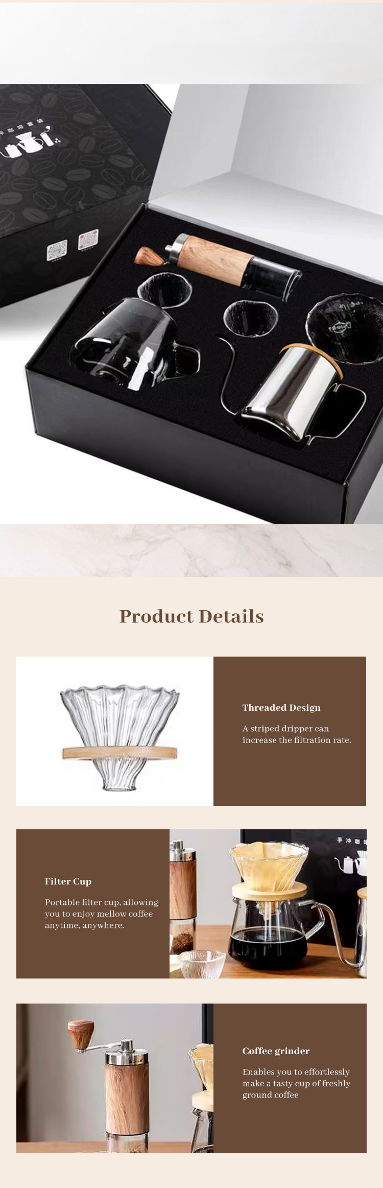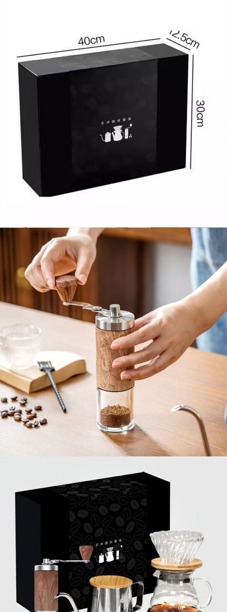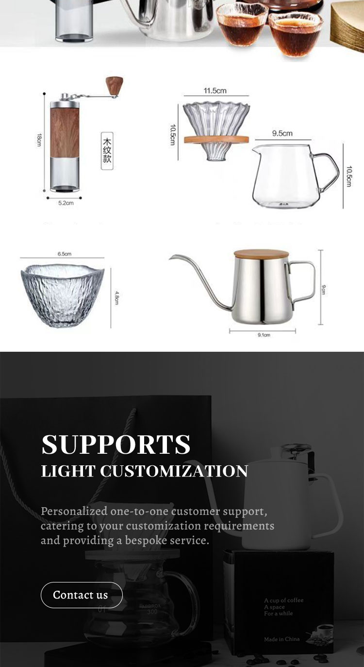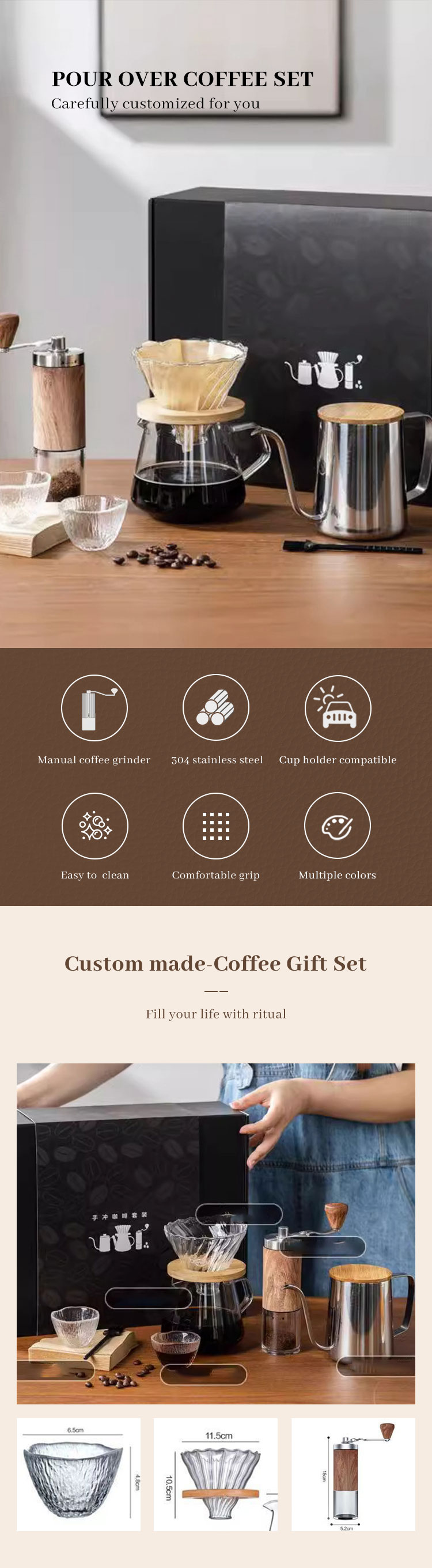 Coffee grinder x1 + wooden base glass filter x1 + 500ml cloud pot (with lid) x1 + 350ml stainless steel pour-over kettle (with bamboo lid) x1 + 50 filter papers