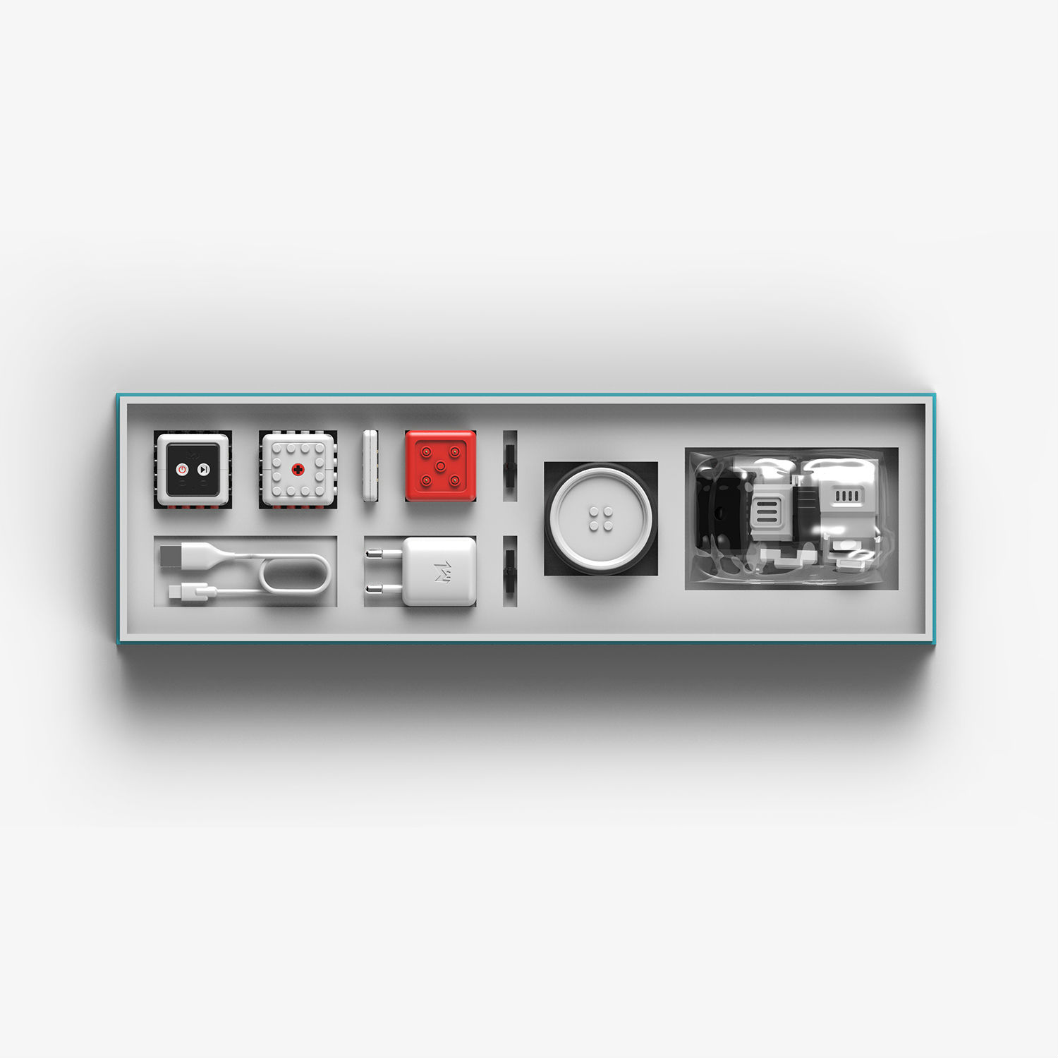 Window cube x 1, motor cube x 1, bridge x 1, nick character pack x 1, wheelset x 2, charger cube x 1, user manual x 1, charger set x 1