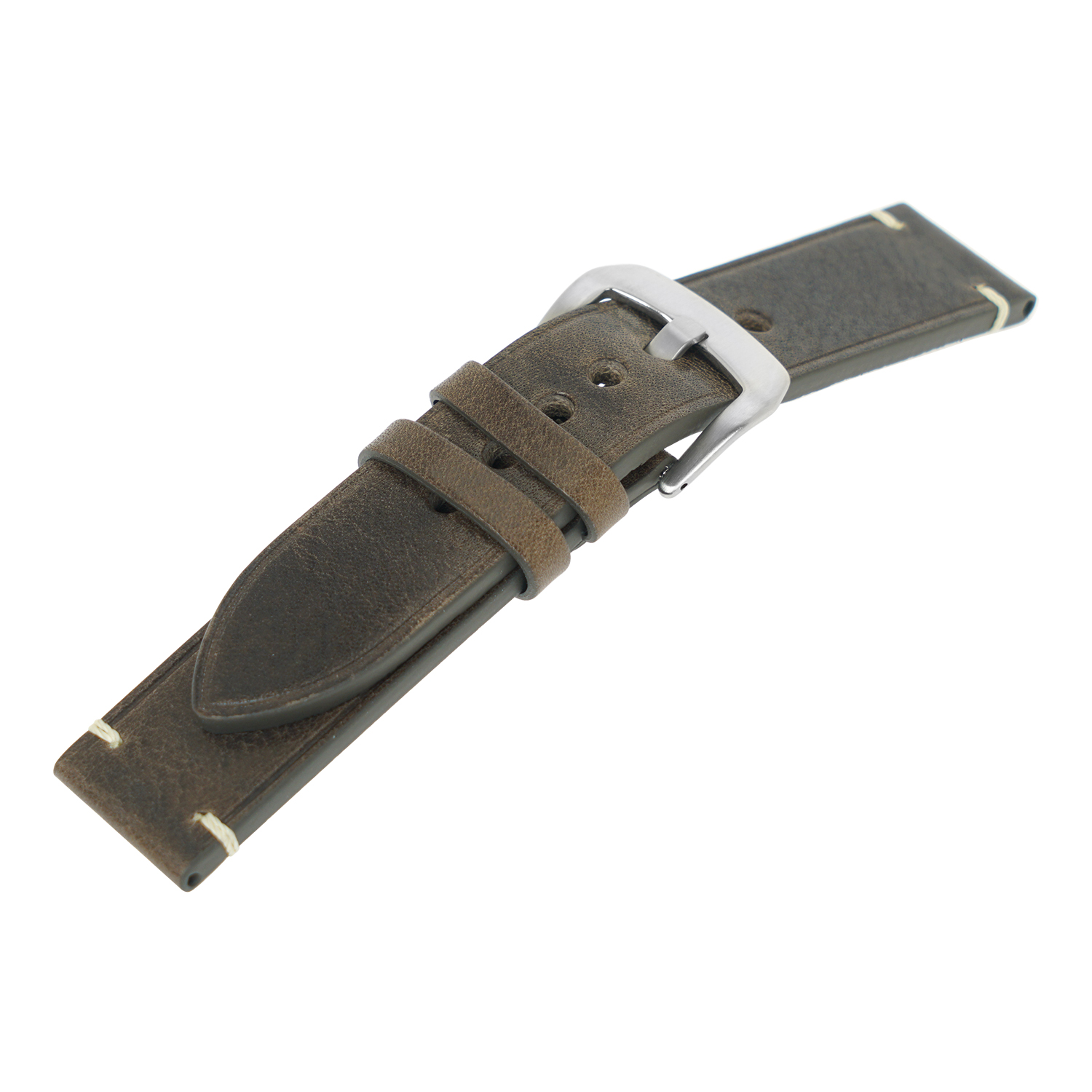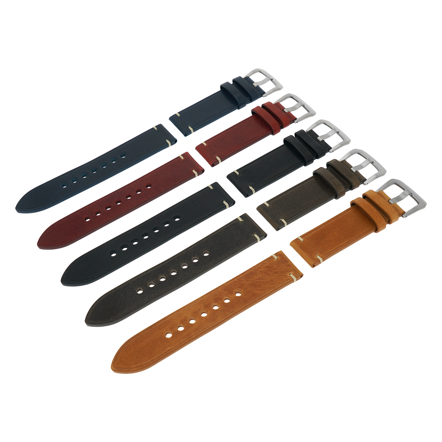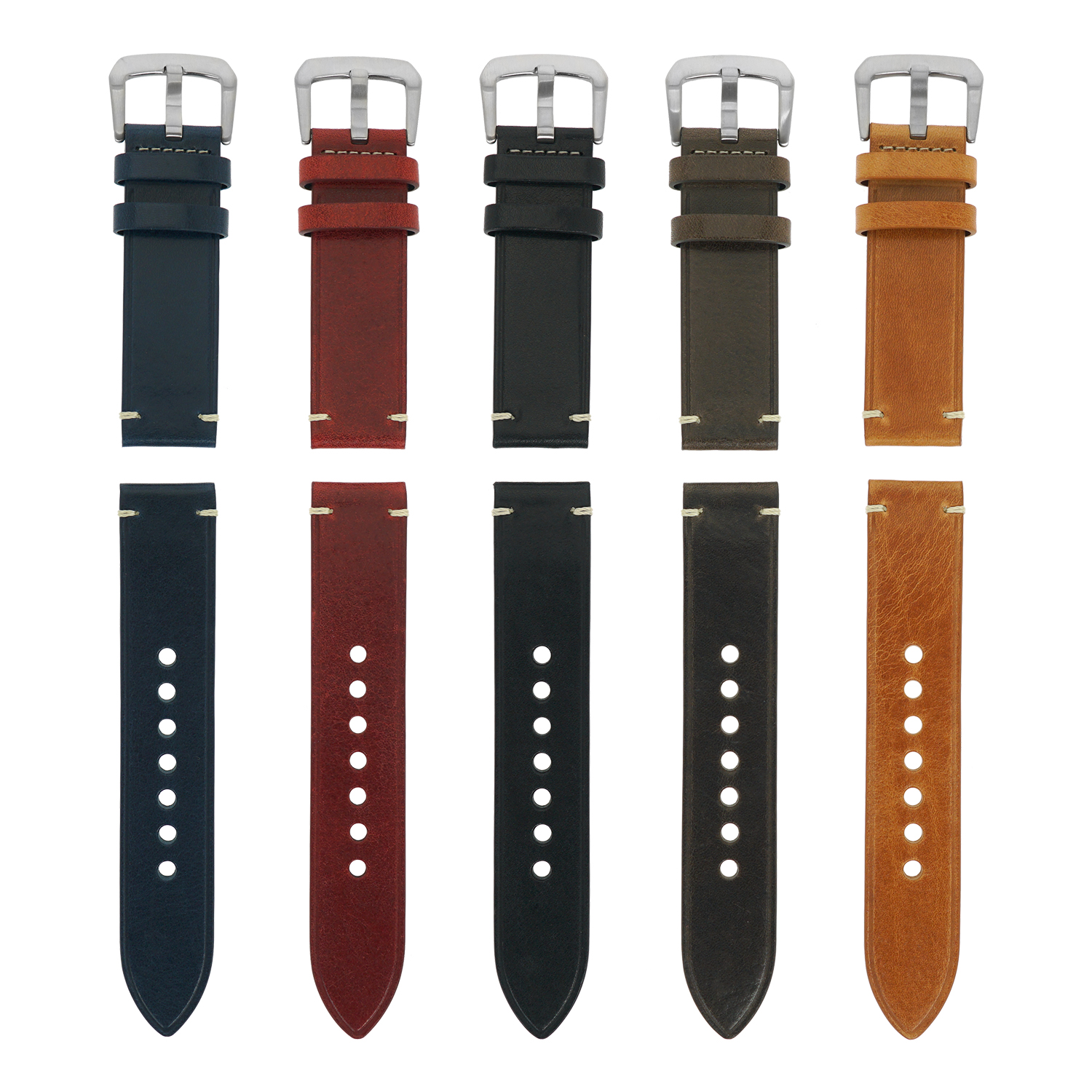 This watch strap is made of vegetable-tanned leather and trimmed with matching stitching for more detail. It looks polished, stylish, and balanced. For a sheeny touch and classic finish, this strap is paired with a stainless steel buckle. This watch strap is classy and stylish, and it will appeal to all urbane men.