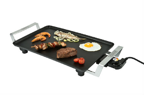 ? 220-240 V / 2400 W ? Frying and grilling without oil and butter, so healthy and lean ? Ideal for meat, fi sh and vegetables ? Healthy alternative to the barbecue ? Great fun cooking at the table together ? Large size hot plate of 46 x 30 cm ? Daikin 2 layer non-stick coating ? Removable probe control ? Adjustable thermostat & temperature light ? Overheat protector ? Hotplate is dishwasher safe ? Cool-touch real aluminium handles ? 6 wooden spatulas included