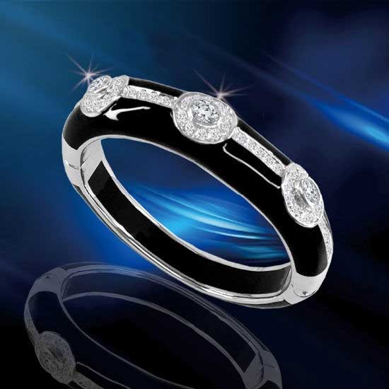 This classic silver bangle is adorned with sparkling CZ stones and black resin. The bangle is plated with rhodium for added shine and durability. The bangle is secured with a hidden clasp.
