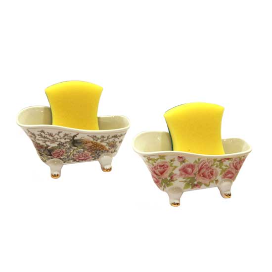 This is an elegant container designed for holding cleaning clothes. It is crafted in a bathtub shape with four feet. This piece is made of white porcelain with beautiful flower patterns on the exterior.
