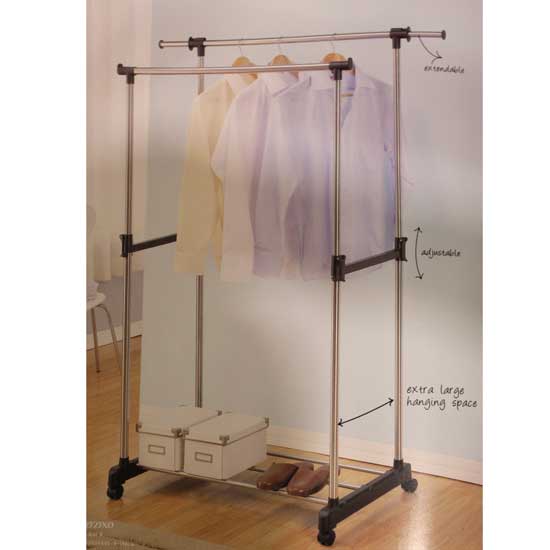 The movable clothes rack is equipped with four wheels for easy movement. The adjustable and extendable design allows efficient use of space. This clothes rack provides a simple but effective way in keeping your clothing organised.