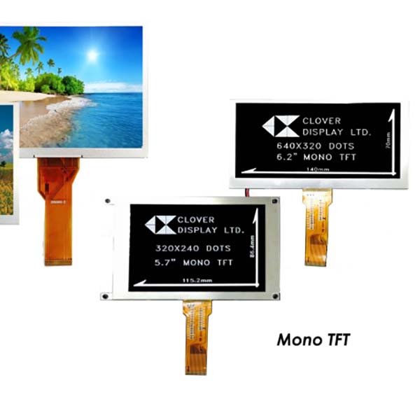 Clover’s TFT displays are designed to provide solutions to upgrade from standard monochrome displays. Our TFT displays’ range is from 3.5” to 10” which are suitable for industrial instruments, medical equipment, automation and GPS, etc. What’s more, We also provide controller board for customers to easily convert the RGB interface to MCU interface. The Mono TFT displays are with high contrast, brilliant brightness, wide viewing angle and fast response time.