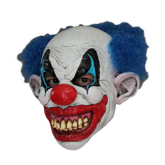 This is a latex mask flaunting a clown appearance. The clown features blue hair, a white face with red lips, a red nose and dirty teeth for an ugly look. This clown latex mask is sure to make you a focus point in the Halloween party.