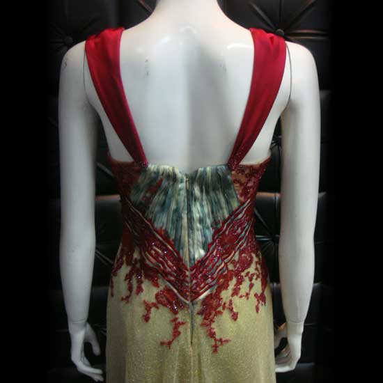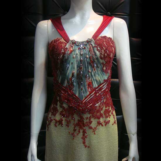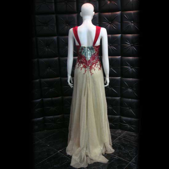 This ladies' cocktail dress features a sophisticated and glamorous design. The pretty dress is accented with contrasting beadings and appliqués on the front. The shoulder straps and back zipper closure complete she design of this gorgeous piece.