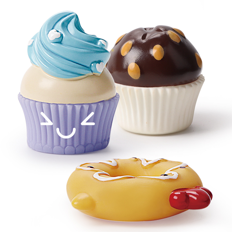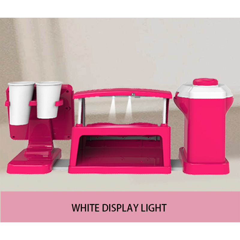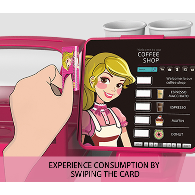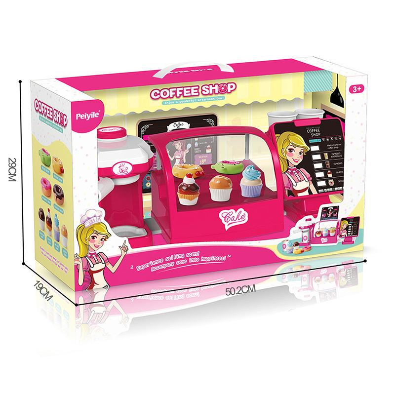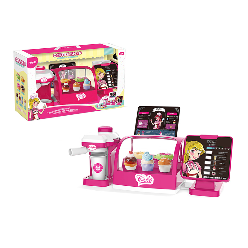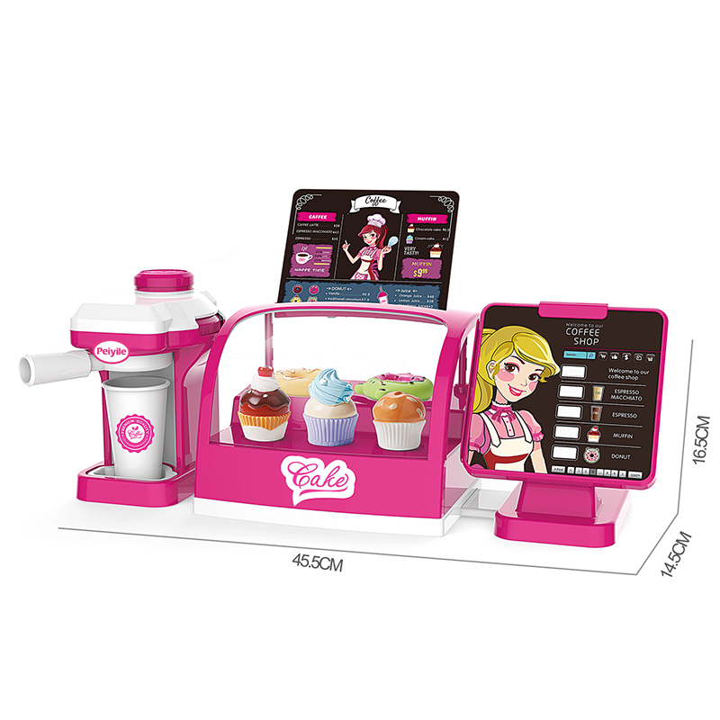 There are 3 coffees, 2 cups,randomly matched 3 cakes and 2 donuts,Simulated sales scenario,and with function of lighting, keypad with voice