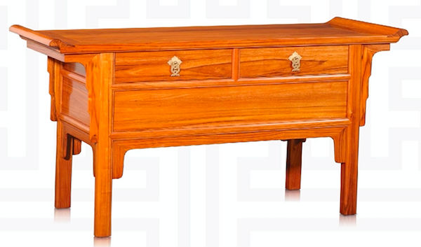 This coffer table is a multifaceted furniture of table at the top, and a cabinet of two drawers underneath. It is also built with a hidden chamber to store valuable items such as jewelleries.