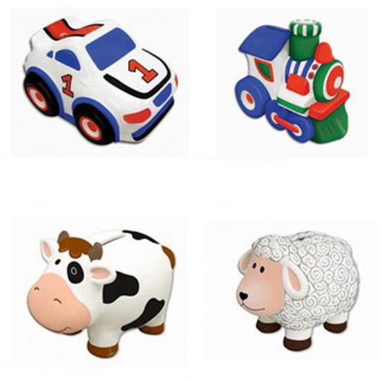 Highlighted is a series of coin bank coming with a cute design. The shell is painted in sharp colors to look attractive to children. These money banks can be put on desktops to remind children to save up their pocket money.