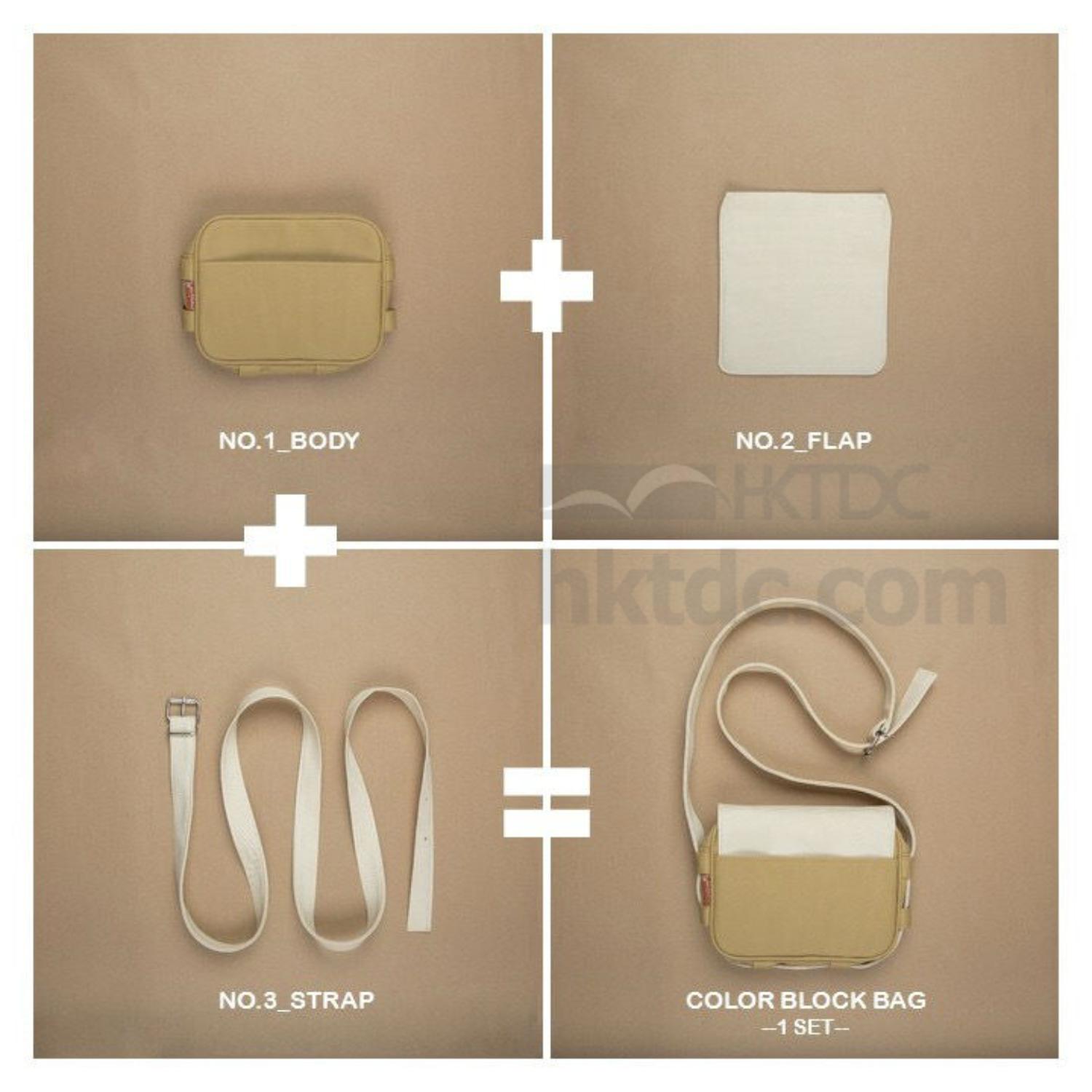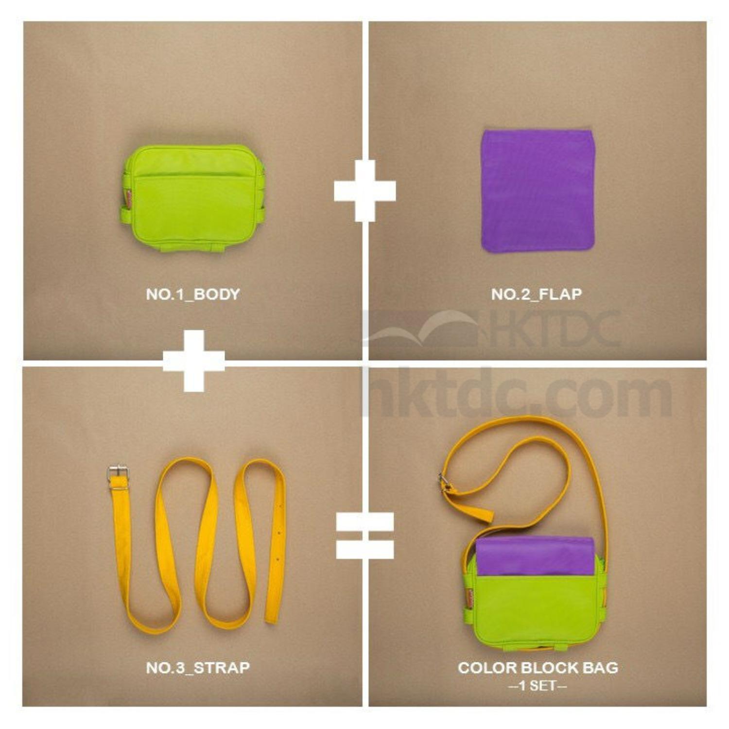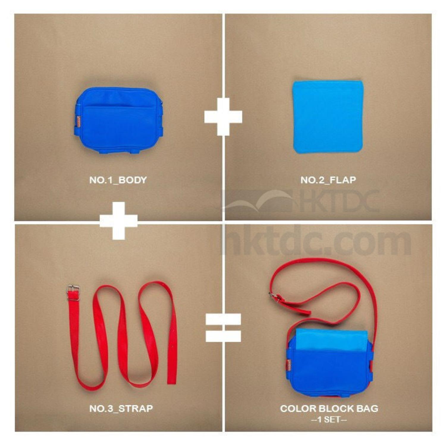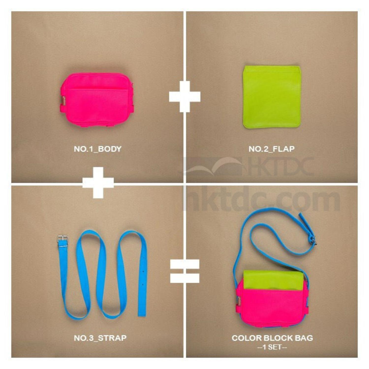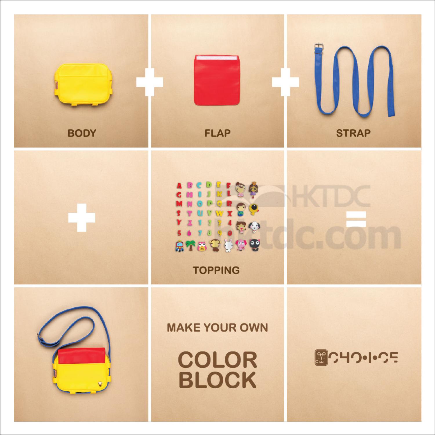 Body + flap + cross-body strap + topping = CHO-I-CE “COLOR BLOCK BAG”