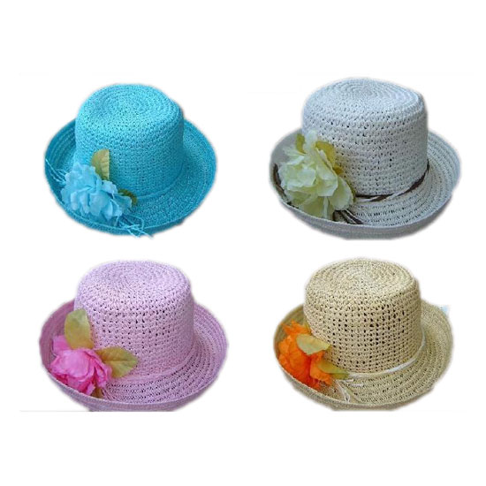 These hats offer a touch of summer fun with vibrant floral decorations. They feature textured shells in a range of appealing tones. These pieces look great with casual or elegant outfits.