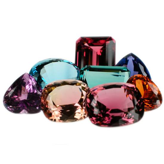 These are a wide range of coloured gemstones with different shapes and faceted cuts. The cuts include step cut, brilliant cut, rose cut and mixed cut, in a round, oval, heart, cushion or emerald shape.