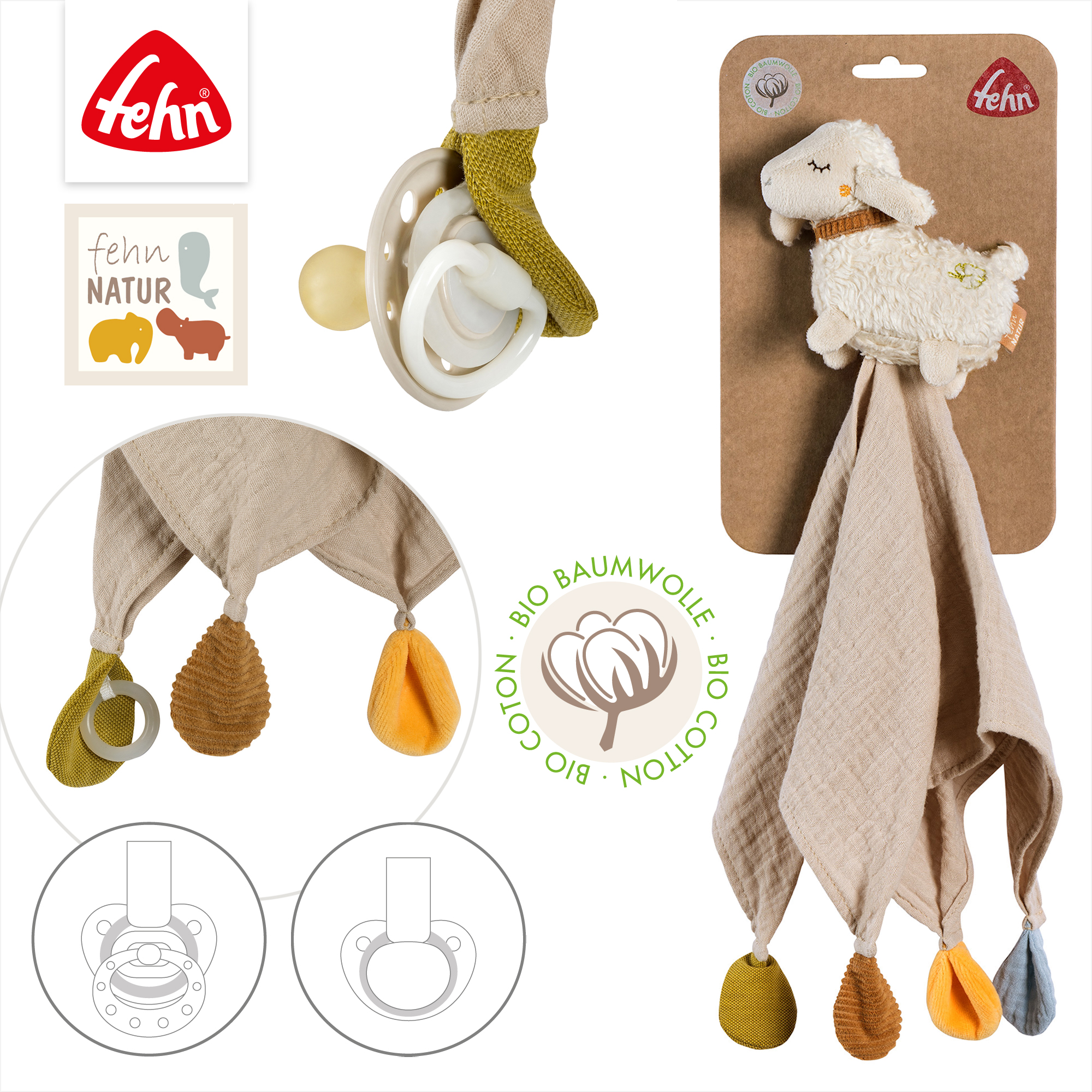 The adorable sheep comforter from the fehnNATUR® sheep collection is a comforter, sleep aid and cuddly friend all in one and is baby's loyal companion at home and when travelling. When falling asleep, the cute cuddly sheep provides a sense of security. During the day, the outer materials and the organic cotton filling from controlled cultivation invite babies to grasp, feel and cuddle, so that the adorable sheep will soon be a favourite. The practical attachment ring on the comforter ensures that baby's pacifier doesn't get lost on big adventures.