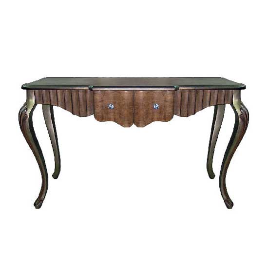 This console table is made with skillful craftsmanship and presents a classic style. The antique brown tone with gold accents on the carved wave outlines the solid rubber wood legs and two dovetail drawers. The meticulous construction ensures a long service life.