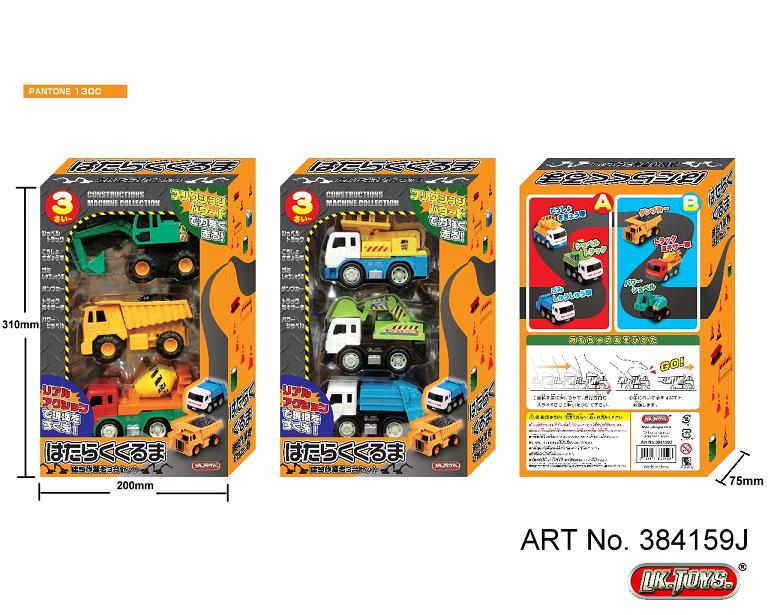 This is a collection of construction toy machines that comes in a window box. Each featuring three different types of vehicles, this toy set is fun to play with. The toys are friction-driven for durable playing.