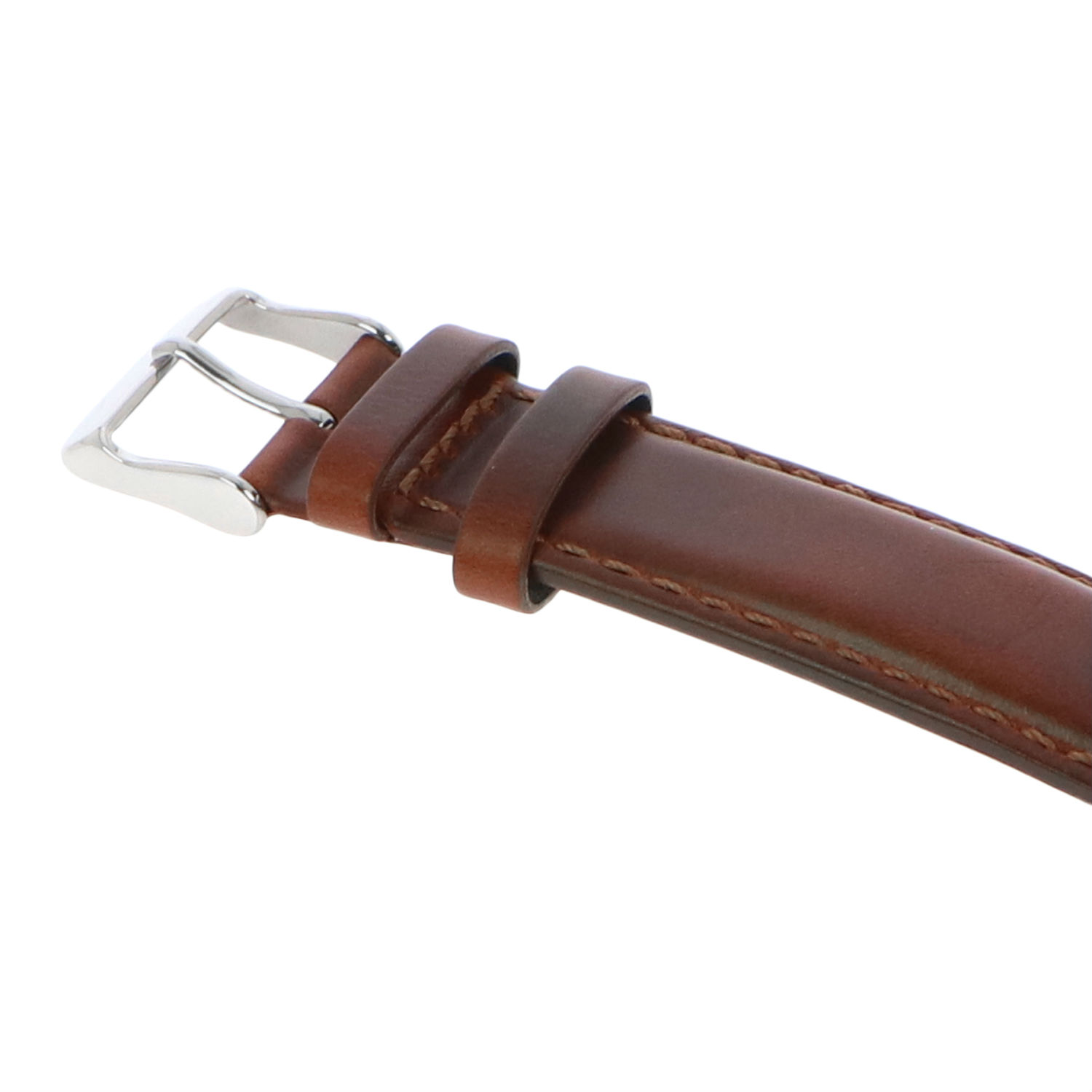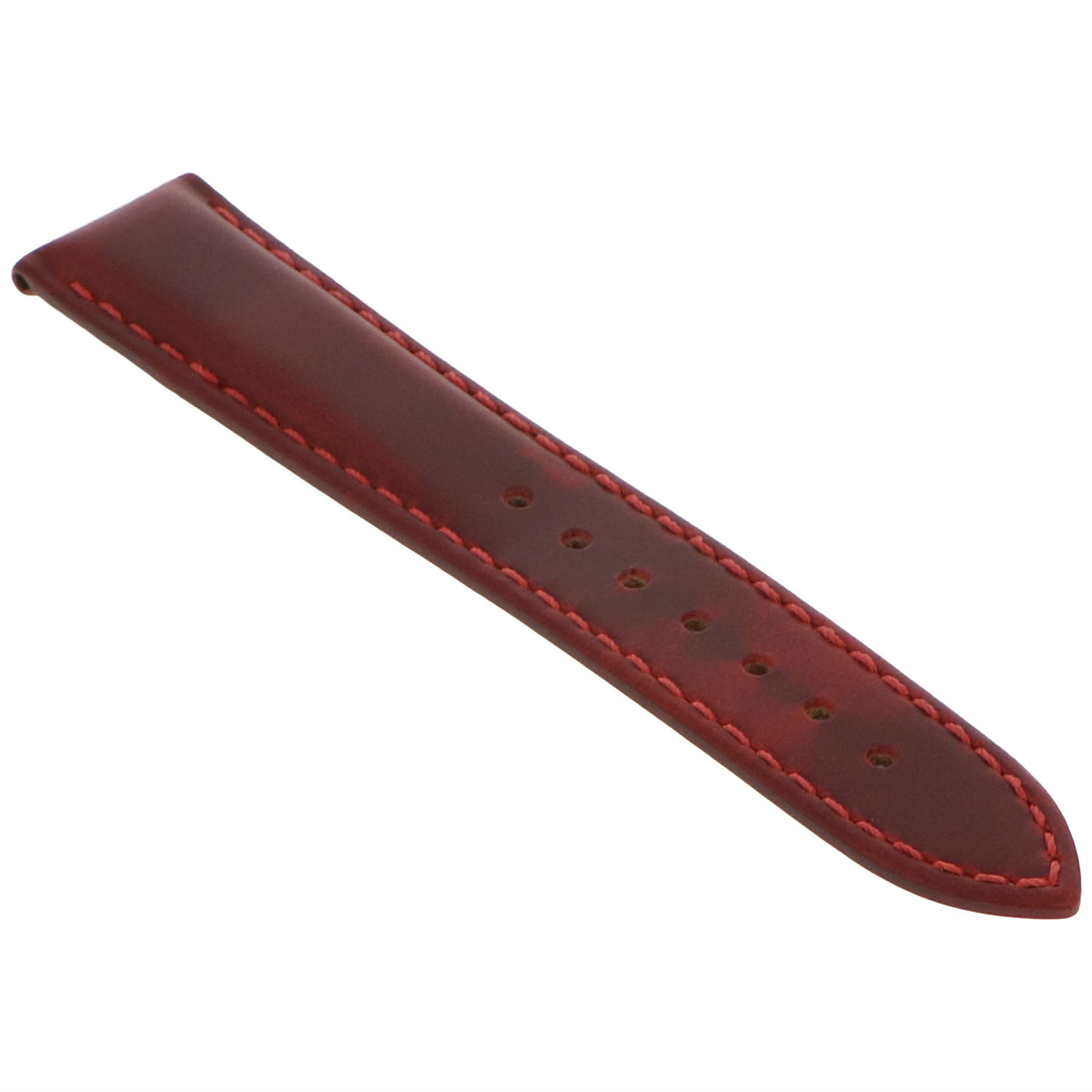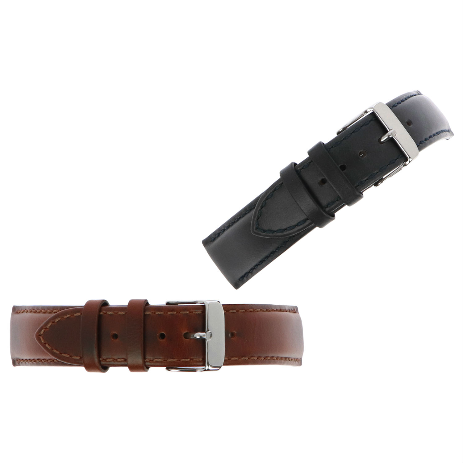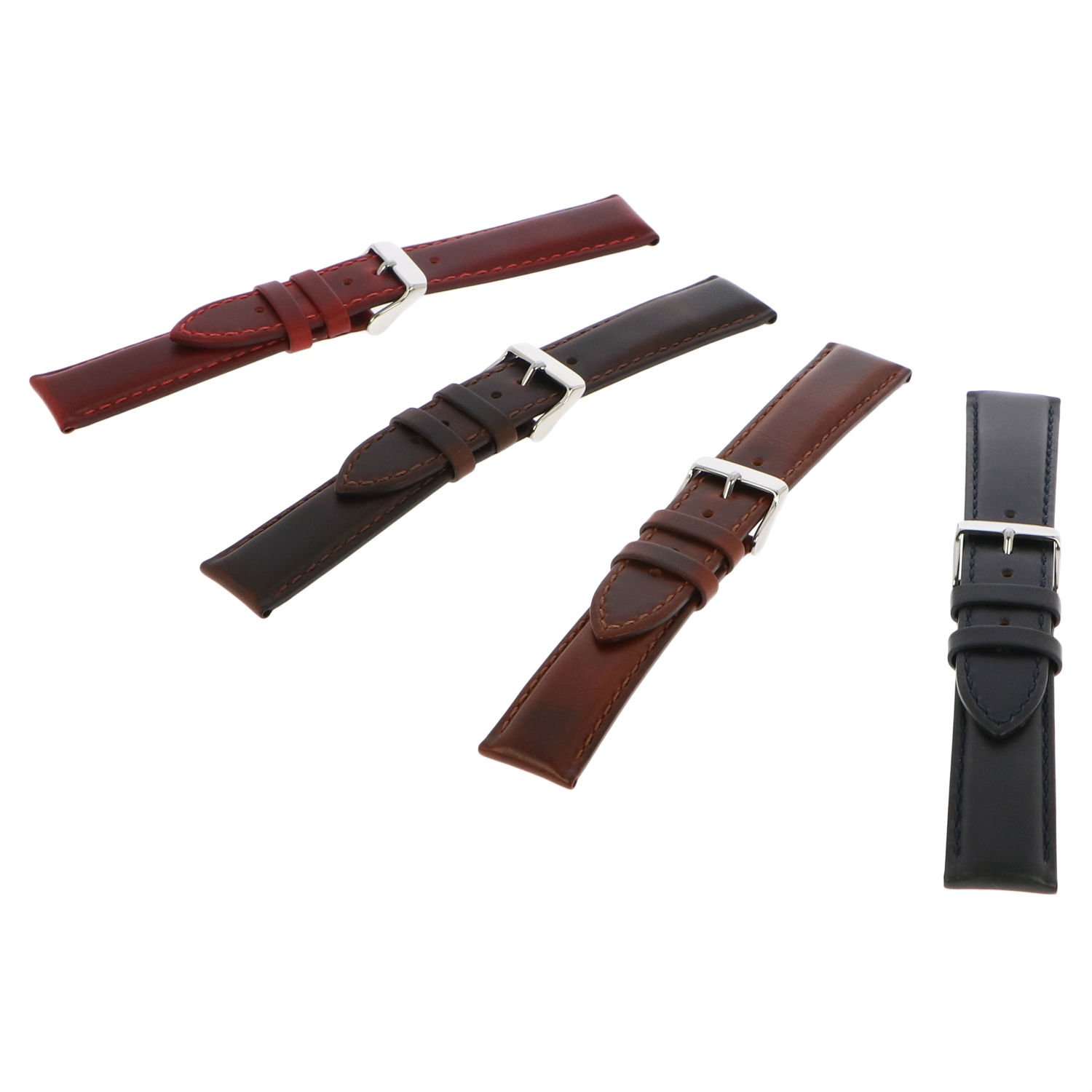 This watch strap is made of oily cowhide with a waxy pull up and has semi-turn edges. It comes in a half padded style with stitching and is matched with a polished stainless steel buckle. The watch strap has multiple holes for length adjustment and is excellent for add a contemporary touch to watches.